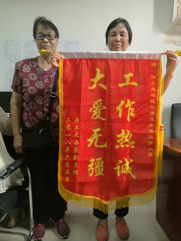6月6日,家住西苑的刘月桂老人在邻居的搀扶下,颤巍巍地来到西工大社区办公室,将一面锦旗送到社区工作人员高燕手上,老人激动地说:“高老师,终于能当面给你说声感谢了!”