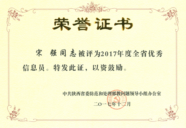 我校社区副主任宋强同志被陕西省委防范和处理邪教问题领导小组评为2017年度优秀信息员。