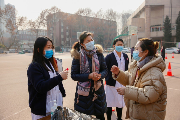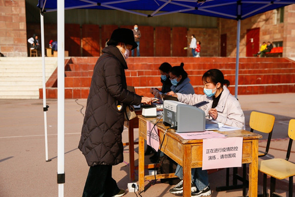 “演练开始,请有序排队!”下午3时,在社区工作人员指挥下,核酸检测应急演练在友谊校区爱生广场展开,参加演练的社区居民及医务人员有序进入现场。