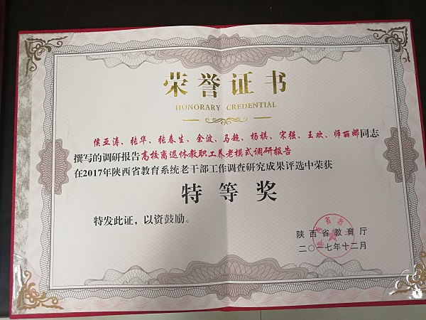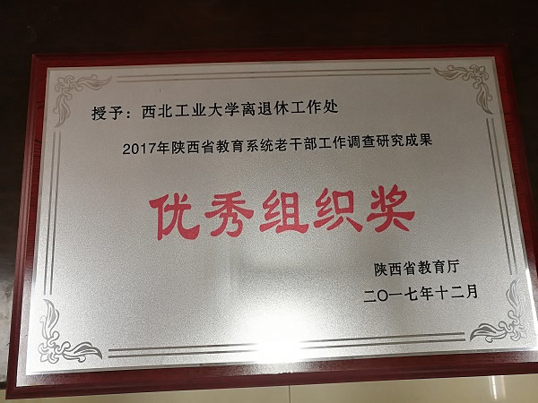 全省教育系统老干部工作调查研究成果评选活动共收到123篇调研报告,经专家组评审,西北工业大学离退休工作处等4家单位获得优秀组织奖,我校提交的《部分高校离退休教职工养老模式调研报告》获得调研报告特等奖。