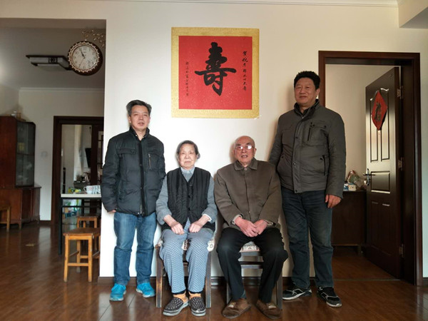 张春生代表离退休工作处恭祝老人福如东海,寿比南山,工作人员为老人挂上了喜庆的“寿”字中堂,倪老和老伴徐保民对于工作人员的到来特别高兴。离退休工作处人员与老两口亲切交谈,话家常。两位老人在生活上相互扶持、注意饮食,身体非常健康,思路清晰,生活简单却又幸福,儿女每天都来看望老人。整个聊天中两位老人脸上始终洋溢着幸福的笑容,说的最多的还是感谢,感谢党的政策,感谢美好的社会,感谢学校的关怀。