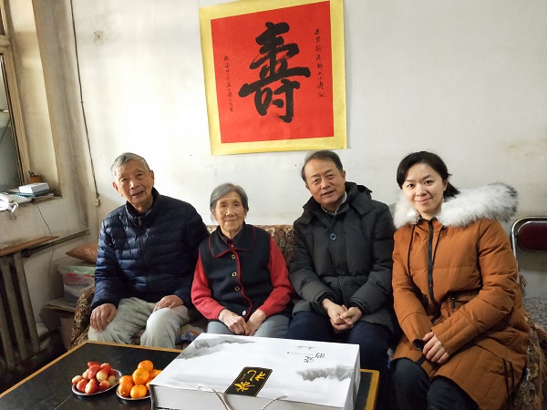1月8日上午,离退休工作处副处长王华、退休科科长胡婷及工作人员带着学校的关怀及祝寿礼物分别前往胡克江、胡之君两位老师家中祝贺九十寿辰。胡克江老师精神矍铄、思维清晰,生活状况良好;胡之君老师生活积极乐观,身体非常健康,生活简单幸福。