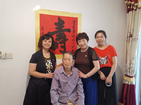 7月12日上午,离退休工作处副处长张华、老干科科长余波及工作人员一行带着学校的关怀,带着祝寿礼物上门为陈志温老师祝贺九十岁寿辰。