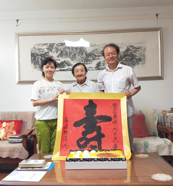 王华副处长首先代表离退休工作处祝范老师身体健康,万事如意,幸福长寿,天伦永享,并为老寿星送上祝寿礼物及“寿”字斗方,范老对我们的到来感到很高兴。