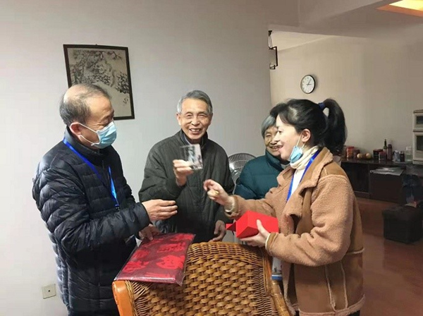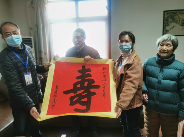 2021年11月5日,离退休工作处副处长王华、退休科科长胡婷及工作人员带着学校的关怀,带着祝寿礼物上门为佘公藩老师祝贺九十岁寿辰。