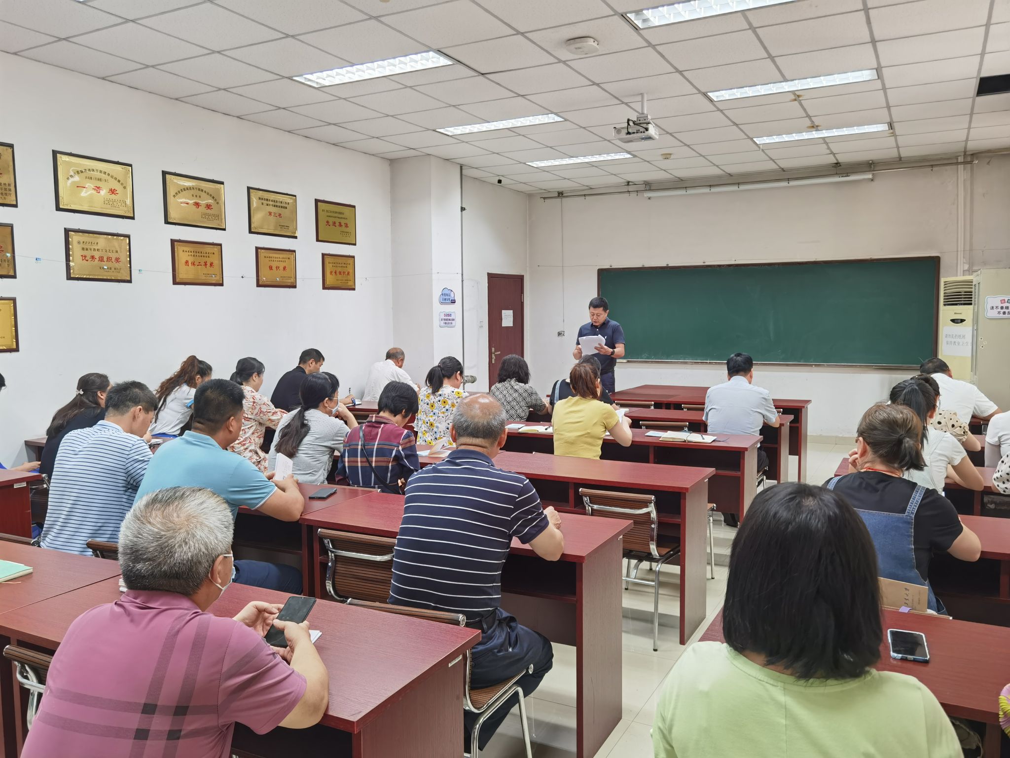 7月5日,离退休党委在健翔楼四楼教室召开全体教职工大会开展师德集中学习教育。离退休党委书记赵洪章主持会议。