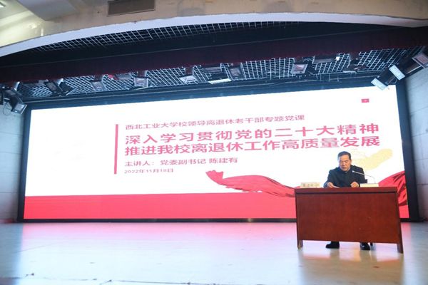 学校党委副书记陈建有在健翔楼为离退休老同志讲授学习贯彻党的二十大精神专题党课,以《深入学习贯彻党的二十大精神推进我校离退休工作高质量发展》为题作报告,李保义、姜澄宇、施作勤、李应昭、郅宝森等离退休校领导,以及离退休党支部书记、离退休工作处全体党员参加党课。