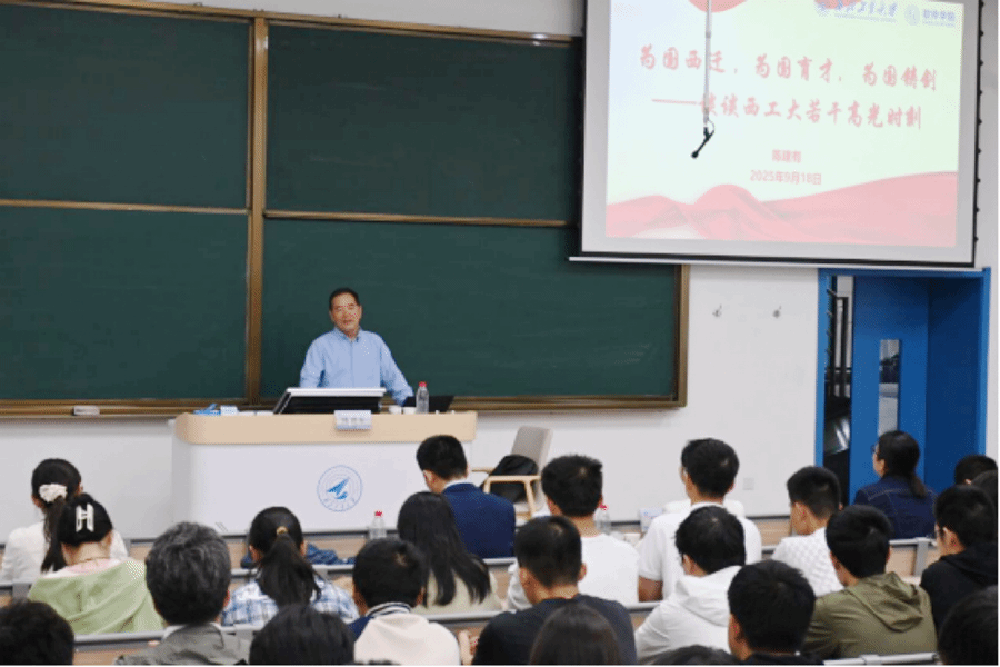 讲座伊始,陈建有阐释了“为国西迁、为国育才、为国铸剑”的来源与现实意涵,指出其既是对办学历史的凝练,也体现了新时代对人才与科技创新的召唤;他系统梳理了西工大在服务国家重大战略需求中的辉煌历程,从抗战时期“古路坝灯火”所点燃的救国理想,到国庆阅兵等重大任务中闪耀的“西工大身影”,从师昌绪、陈士橹等先辈筚路蓝缕的开拓精神,到如今师生参与武器研制、培养“总师型”人才的生动实践,展现出学校将育人内核与校史校情深度融合的深厚底蕴。这些高光时刻背后的故事,不仅让师生深切感受到学校厚重的历史积淀与炽热的家国情怀,也使大家对“公诚勇毅”“三实一新”的校训校风有了更真切的体悟,进一步深化了对“总师育人文化”以及学校始终与国家同频共振、为国防事业育英才精神脉络的认知。最后,陈建有展望“天下工大,世界三航”的远景目标,希望每一位西工大学子将“为国铸剑”刻入青春坐标,让“西工大身影”始终闪耀在国家需要的地方。