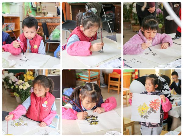 经过观察与讲解,孩子们个个跃跃欲试,拿起毛笔,有模有样地开始创作,小小的手紧握毛笔,一笔一画勾勒菊花轮廓,细心地用颜料涂色花瓣,“爷爷我想画一朵紫色的菊花”、“奶奶我喜欢黄色的”……在爷爷奶奶地悉心指导下,大家纷纷完成了自己的作品。
