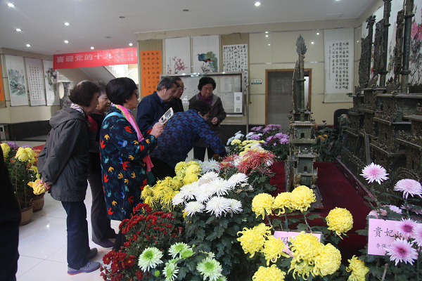 本届花展展出了50余名协会成员的200余盆作品,展期十天。展出花卉以菊花为主,有金龙腾云、圣光花房、贵妃醉酒、白玉珠帘、太白积雪、国华春、丽金、绿野等近百余种,其颜色艳丽,形态各异,白的胜雪,红的似火,黄的如金,绿的赛玉,另有其它品种,如扶桑、绣球、万寿花、绿萝、铁树等30余品种。……一盆盆怒放的花朵构成了一个多彩的世界。老同志们徜徉其中,品花赏花,乐在其中。