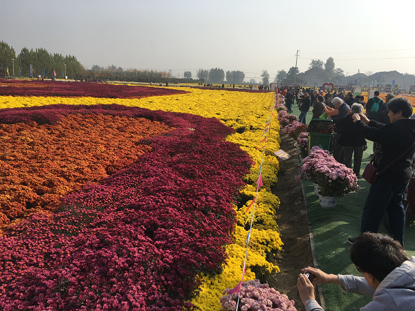 今年是鄠邑区祖庵古镇首届重阳仙菊文化节展。园区内展出65亩约400个品种的各色菊花,仅铺地菊就有金阳、矮黄、嫣红、云海、早红等36个品种,品种多样、美不胜收,簇拥成团供游人欣赏。大美祖庵展示区,再现的是菊花勾勒出的终南山水共天一色的宏大壮观美丽自然景象;重阳仙菊太极风展示区,展现的是全世界最大的直径为81米的菊花太极图;特别是精品菊花展示区,约400个珍贵菊花品种景观带。老同志徜徉在菊花园中一面品评菊花的长势,一面向园区技术员咨询养植的技术、讨论着菊花的特性、养花的技巧及栽培的方法。摄影协会会员有的俯身从上到下、有的蹲下从下向上,有的踮起脚尖近距离的从各个角度将菊花的娇人之姿摄入镜头、定格在永恒的画面中。