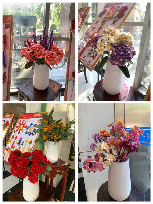 值得一提的是,此次手工展品令人耳目一新,展板上的冰墩墩、雪容融活灵活现,红色的党旗金色的党徽勾勒的一丝不苟,吉祥喜庆的中国结彰显出中华传统文化的独特魅力。高低错落的博古花架上一瓶瓶五颜六色的手工花卉明媚绽放,其灵感来源于“永不凋谢的奥运之花”——由海派绒线编织技艺编织而成的北京冬奥会颁奖花束。红玫瑰、黄桂花、白绣球、粉月季……美丽逼真,仿佛有香气萦绕在鼻尖,近看一针一线勾勒的精巧别致,让人不禁惊叹于老同志们心灵手巧和精湛技艺。她们将对祖国的赞美和祝福寄托在绕指的丝线间,用百花盛放迎接党的二十大胜利召开,充分彰显了我校老同志的文化自信,为促进学校精神文明建设、社会主义文化强国贡献力量。