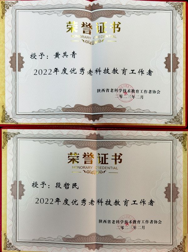 我校荣获陕西省老科学技术教育工作者协会2022年度“先进集体”奖;段哲民、黄其青两位教授被授予2022年度优秀老科技教育工作者荣誉称号。我校老科协会长胥效文、离退休工作处社团中心主任杨祺参加了会议。