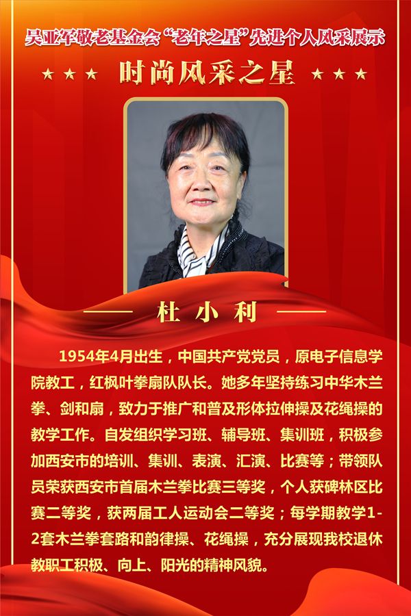 “吴亚军敬老基金”是由我校校友吴亚军女士于2011年捐赠设立,设有“老有所为”先进集体奖和“老年之星标兵”、“健康长寿之星”、“时尚风采之星”、“和谐互助之星”、“奉献有为之星”五项先进个人奖,通过在红枫叶老年社团和全校离退休教职工中选树先进典型,营造尊老孝老敬老校园氛围,激励和引导广大离退休教职工“老有所为、老有所学、老有所乐”,展示阳光心态、体验美好生活、畅谈发展变化,为党和人民的事业,为学校建设发展贡献银发力量。
