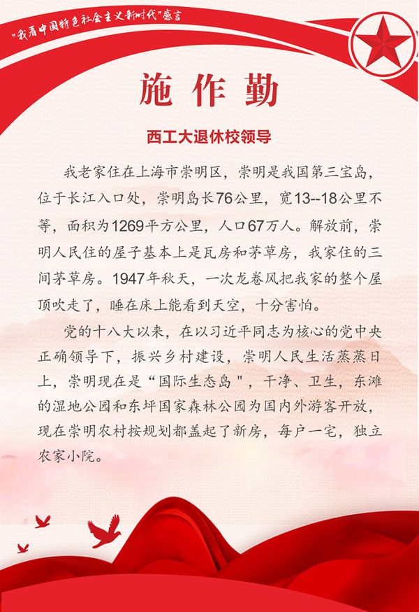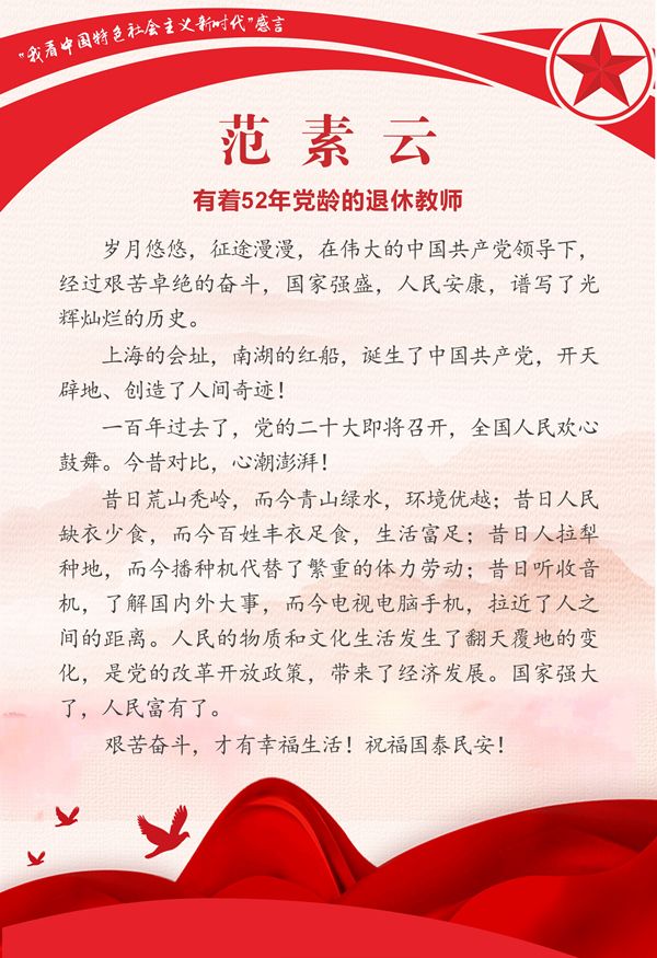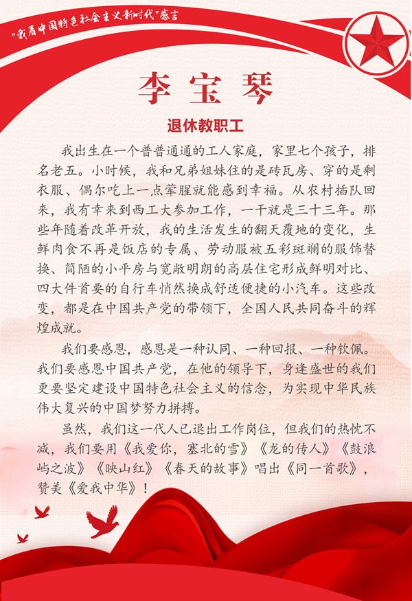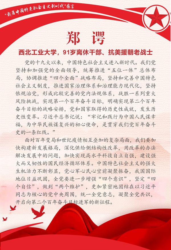 活动从2022年4月份开始,由陕西省教育系统老龄工作委员会举办,各高校离退休工作处具体落实。我校老同志们围绕活动主题畅谈感悟、建言献策,纷纷表达对党的二十大胜利召开的美好期盼和全党全国在新时代取得伟大成就的心声感言,结合亲身经历和专业特长畅谈感受、各抒己见,谈出了对中国特色社会主义新时代发展变化的真切感受、真心认同。本次推送的作品主题鲜明,内容丰富,饱含情感,充分表达了我校离退休老同志对中国特色社会主义的深刻理解和深厚感情。