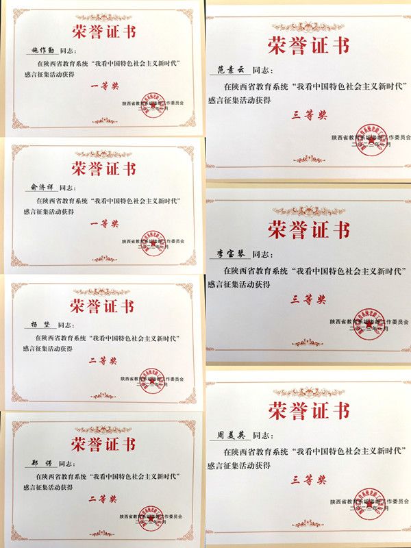 近日,由陕西省教育系统老龄工作委员会举办的“我看中国特色社会主义新时代”感言征集活动评选结果公布,我校退休老同志施作勤、俞济祥获一等奖;郑谔、杨埜获二等奖;李宝琴、范素云、周美英获三等奖。